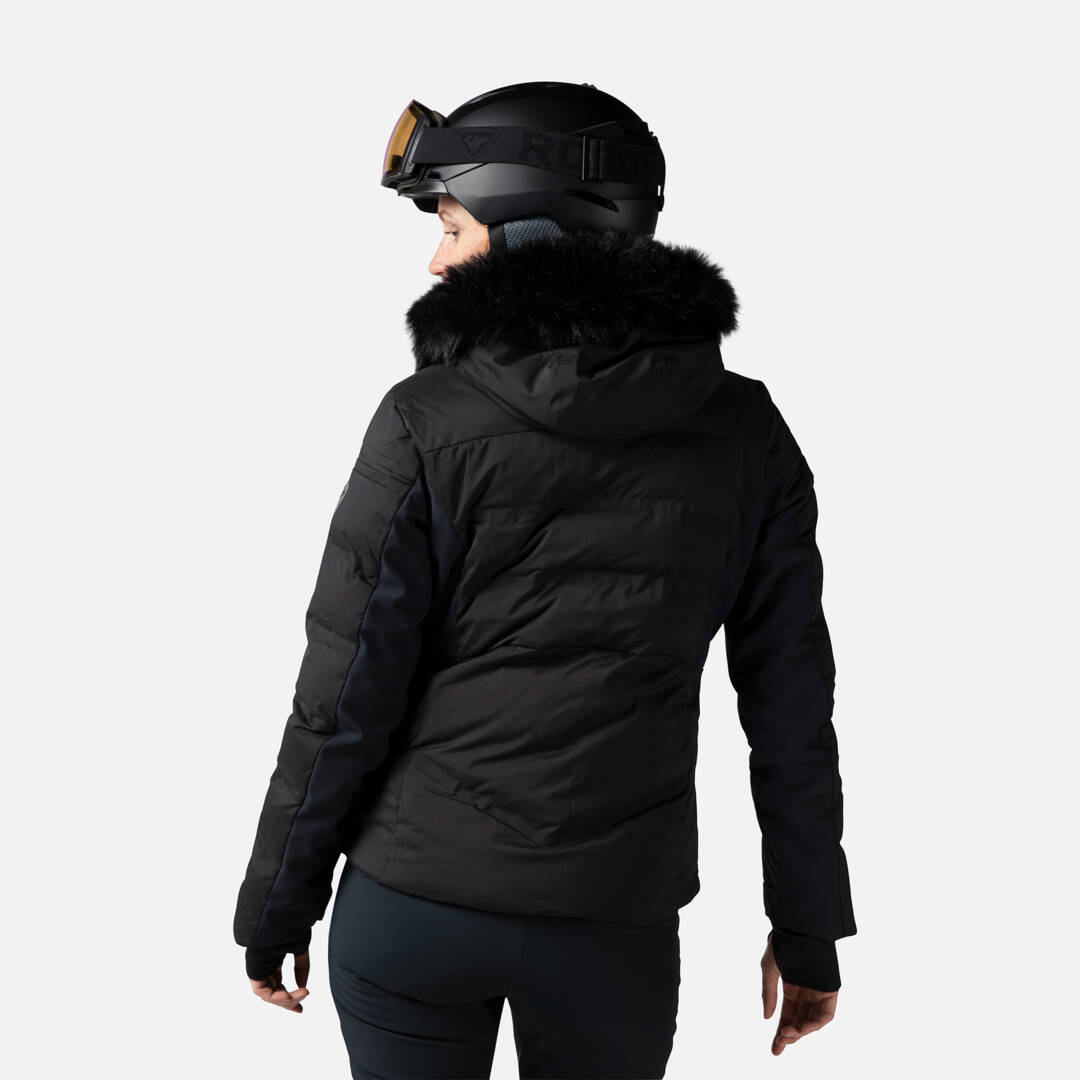 Immerse yourself in winter warmth. The women's Depart Ski Jacket blends the latest waterproof and breathable technology with elegant, mountain-inspired style to keep you warm on the mountain. High-loft synthetic insulation offers premium warmth comparable to the feel of down, and zip vents let you regulate your temperature as necessary. Fully taped seams and bonded insulation baffles enhance storm protection. Details like stretch cuffs with thumb loops, an attached goggle cloth and a built-in powder skirt extend your comfort range on cold days. The removable hood features detachable faux-fur trim so you can customize your look. Rossignol's signature rooster reflects our century-old alpine legacy.